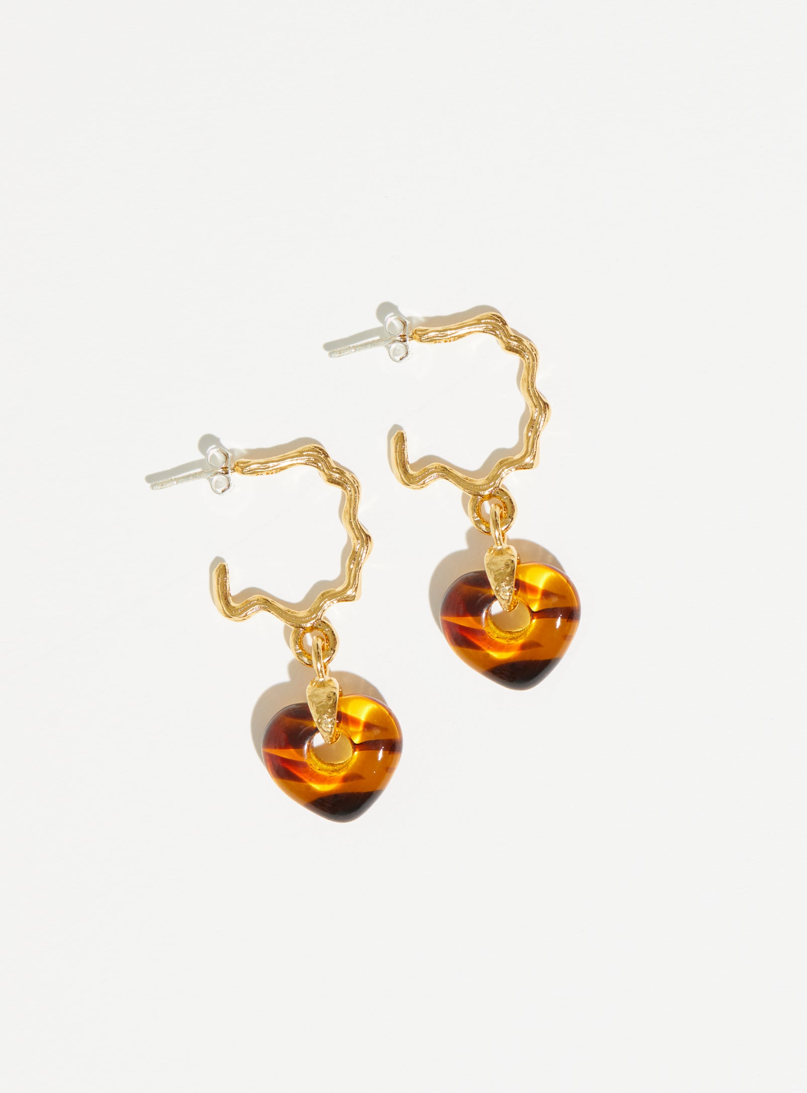 The hoops are gold plated over silver (gold vermeil) or rhodium plated over silver and the charms are Czech glass.
