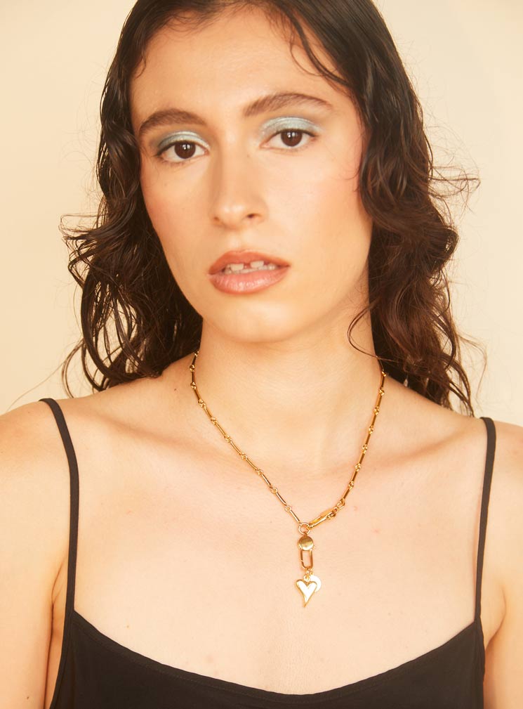 The Heart Charm Clip Chain comes in 22k gold or rhodium electroplate, and is made with 2 long lobster clasps - great for adding your own charms.